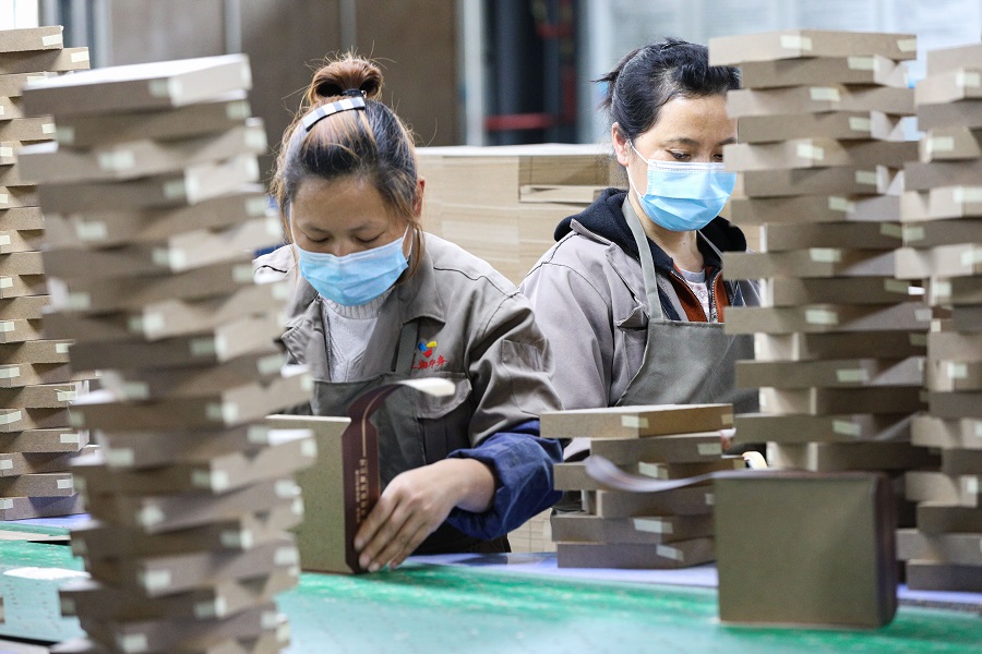 4月22日,湘西經(jīng)濟(jì)開發(fā)區(qū)三湘印務(wù)有限責(zé)任公司,工人在有序加工包裝盒。近段時間以來,當(dāng)?shù)叵嚓P(guān)部門在做好新冠肺炎疫情防控的同時,積極協(xié)調(diào)解決資金、招工、物流等問題,扶持扶貧車間全面復(fù)工復(fù)產(chǎn),幫助貧困戶穩(wěn)就業(yè)、穩(wěn)增收。