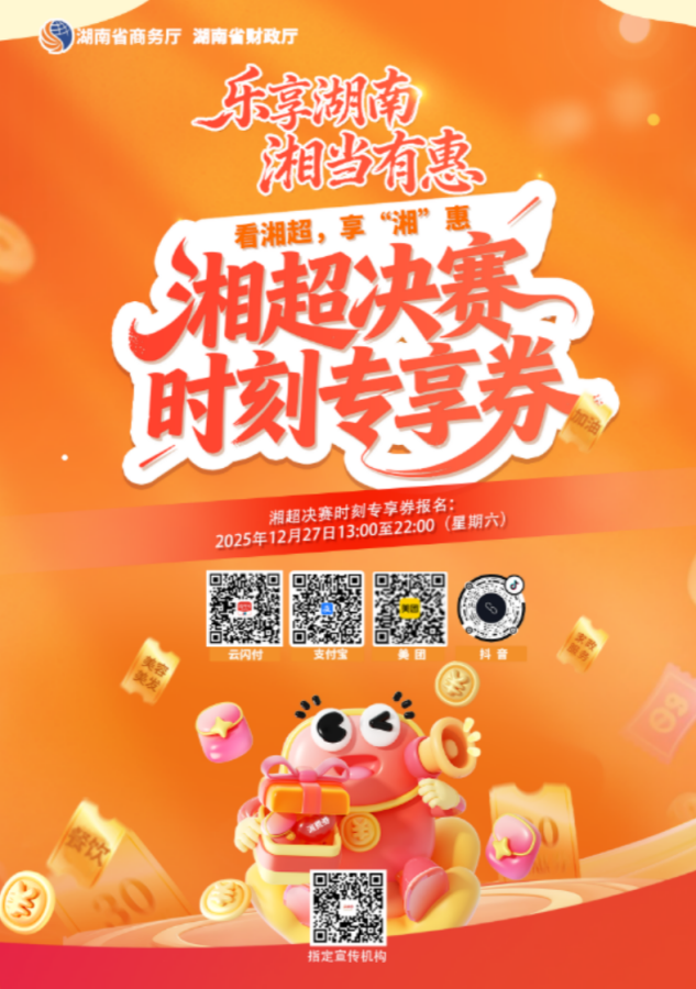在湘超總決賽現(xiàn)場(chǎng),“樂享湖南?湘當(dāng)有惠” 消費(fèi)券報(bào)名平臺(tái)二維碼將隨湘超物料包,發(fā)放至每位觀眾的座位上。觀眾除了可掃描物料包內(nèi)的消費(fèi)券平臺(tái)二維碼直接參與活動(dòng)外,還能通過掃描 “新湖南” 二維碼,查詢?cè)撓M(fèi)券活動(dòng)的詳細(xì)信息,并同步完成發(fā)券平臺(tái)的報(bào)名?;顒?dòng)場(chǎng)外專設(shè)的“湘超決賽時(shí)刻專享券”服務(wù)展位,掃碼領(lǐng)取專享券并進(jìn)入統(tǒng)一搖號(hào)。本次線下發(fā)放通道中簽率高、流程便捷、核銷周期長(zhǎng)達(dá)15天,真正實(shí)現(xiàn)“即領(lǐng)即搖、長(zhǎng)效享惠”。據(jù)悉,報(bào)名通道將于12月27日13:00至22:00開放。