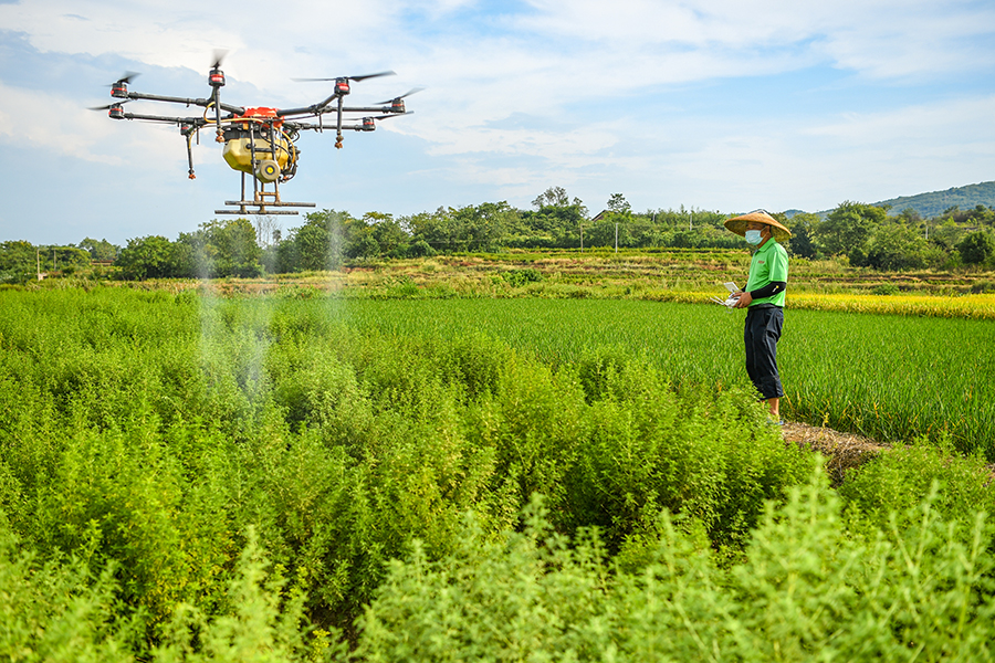 8月18日,冷水灘區(qū)黃陽司鎮(zhèn)水口橋村,區(qū)農(nóng)業(yè)農(nóng)村局工作人員操作植保無人機給青蒿滅蟲。