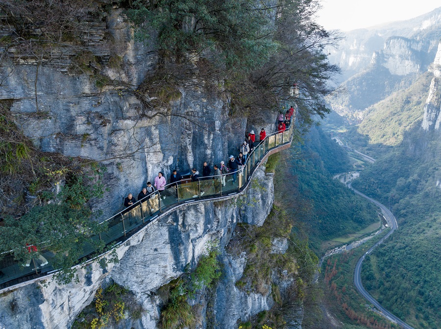 12月6日,吉首市矮寨奇觀旅游區(qū),游客在懸崖玻璃棧道觀光游覽。該景區(qū)憑借獨特的萬年峽谷風(fēng)光、千年苗寨風(fēng)情和百年路橋奇觀,成為冬季旅游的熱門目的地。彭璟 攝
