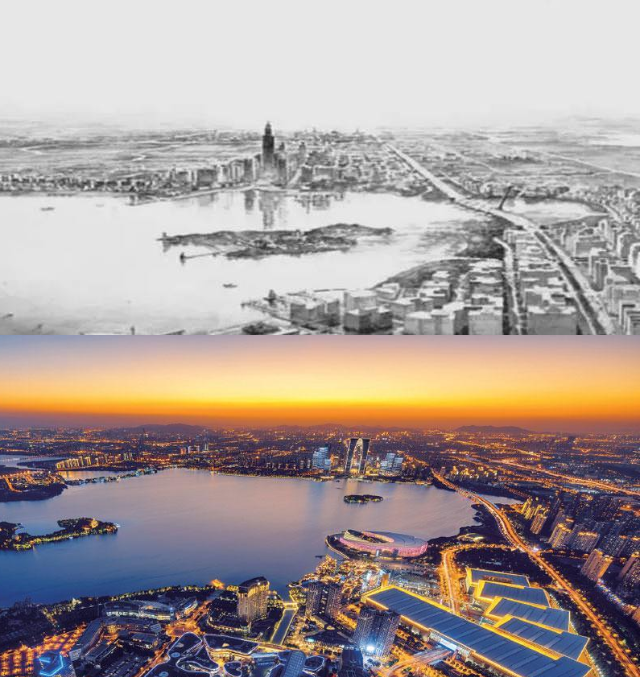 上圖是1994年蘇州工業(yè)園原總規(guī)劃師時(shí)匡在園區(qū)建設(shè)之初手繪的一張規(guī)劃藍(lán)圖,下圖是如今繁華的蘇州工業(yè)園區(qū)。