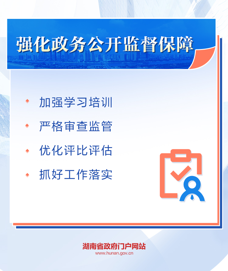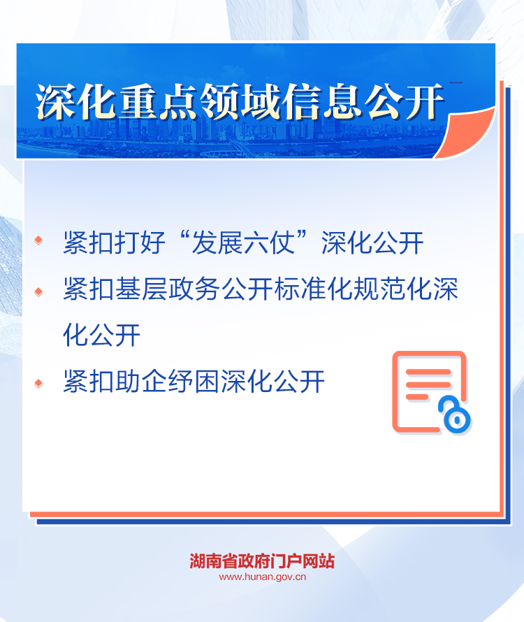 近日,省政府辦公廳印發(fā)了《湖南省2023年政務(wù)公開工作要點》,文件提出緊緊圍繞打好“發(fā)展六仗”,充分發(fā)揮以公開促落實、強監(jiān)管、優(yōu)服務(wù)的職能作用。