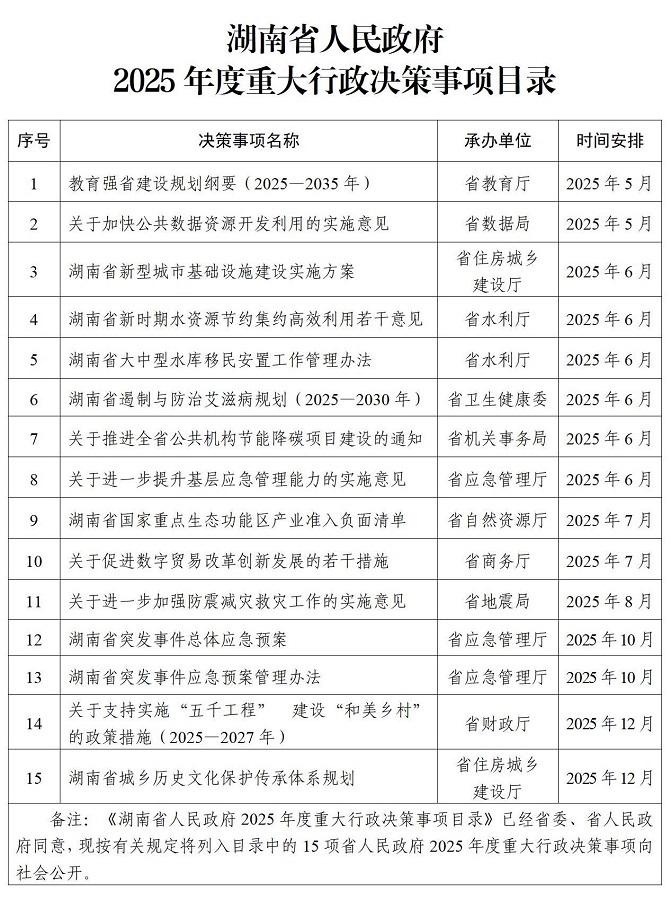 湖南省人民政府辦公廳關(guān)于印發(fā)《湖南省人民政府2025年度重大行政決策事項(xiàng)目錄》的通知