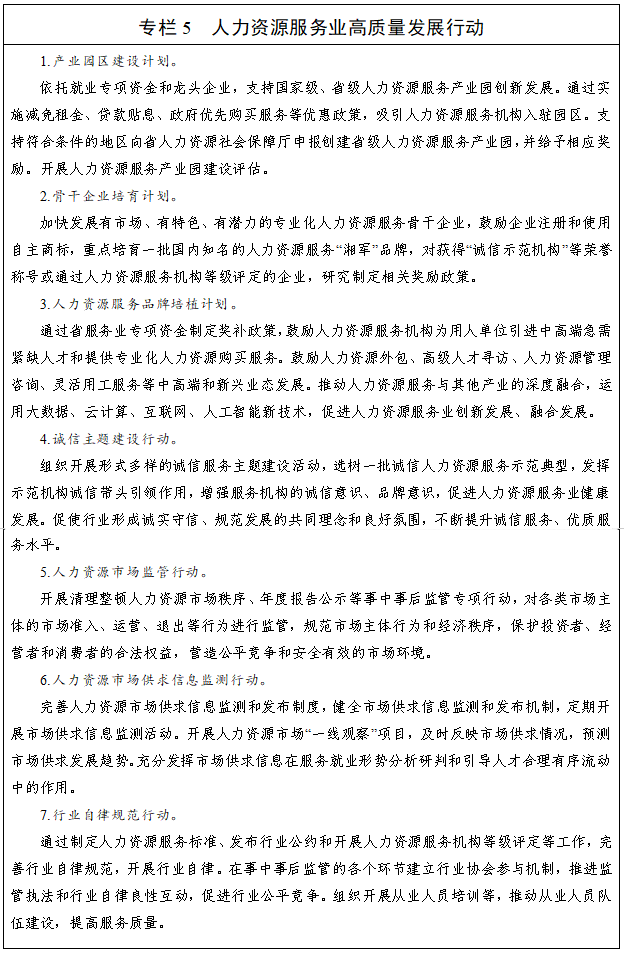 8.推動人力資源服務業(yè)高質量發(fā)展。規(guī)劃和推進人力資源服務產業(yè)園建設。根據相關規(guī)定,加大引才機構財政支持力度,制定獎補政策。鼓勵人力資源服務機構創(chuàng)新服務品牌、服務理念和經營模式,培育一批國內知名的人力資源服務“湘軍”品牌。制定促進我省人力資源服務業(yè)高質量發(fā)展的意見,建設統(tǒng)一開放、競爭有序的人力資源市場體系,逐步形成覆蓋市場運行發(fā)展全過程的法制體系。建立全省人力資源公共服務信息化平臺,探索構建以信息共享為基礎、以信息公示為手段、以信用監(jiān)管為核心的市場誠信體系。