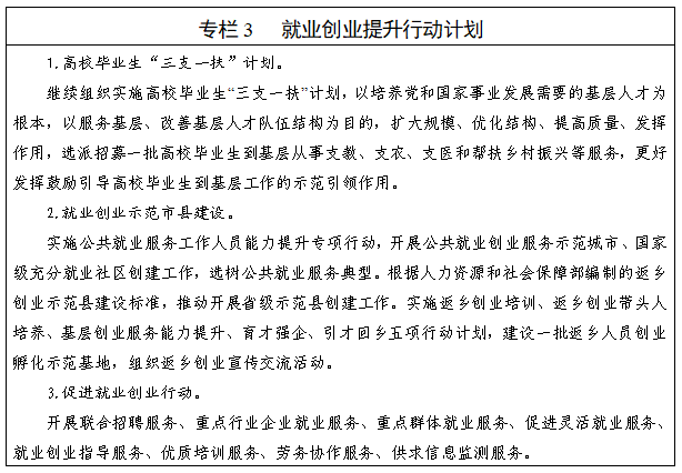 3.完善重點群體就業(yè)支持體系。突出做好高校畢業(yè)生、農民工、脫貧人口、退捕漁民、退役軍人、就業(yè)困難人員等重點群體就業(yè)工作。堅持把高校畢業(yè)生就業(yè)作為重中之重,結合重大戰(zhàn)略布局、現(xiàn)代產業(yè)體系建設、中小企業(yè)創(chuàng)新發(fā)展,創(chuàng)造更多有利于發(fā)揮高校畢業(yè)生專長和智力優(yōu)勢的知識技術型就業(yè)崗位。圍繞鄉(xiāng)村振興戰(zhàn)略,服務鄉(xiāng)村建設行動和基層治理,擴大基層教育、醫(yī)療衛(wèi)生、社區(qū)服務、農業(yè)技術等領域就業(yè)空間。統(tǒng)籌實施“三支一扶”計劃等基層服務項目,暢通基層成長發(fā)展通道,引導更多畢業(yè)生到艱苦邊遠地區(qū)、新興產業(yè)、中小微企業(yè)就業(yè)。為有意愿、有能力的高校畢業(yè)生創(chuàng)新創(chuàng)業(yè)提供資金、場地和技術等多層次支持。強化不斷線就業(yè)服務,多渠道搭建職業(yè)指導、職業(yè)培訓、就業(yè)見習、創(chuàng)業(yè)實踐平臺,對困難畢業(yè)生和長期失業(yè)青年實施就業(yè)幫扶。組織“春風行動”“就業(yè)援助月”“高校畢業(yè)生就業(yè)服務周”“民營企業(yè)招聘月”等公共就業(yè)服務專項活動,對高校組織的校園招聘活動給予校園招聘活動補助。落實鄉(xiāng)村振興戰(zhàn)略,深化勞務協(xié)作組織化程度,促進勞動力供需有效對接,推動農民工有序外出就業(yè)。加大農民工創(chuàng)業(yè)扶持力度,暢通外出務工人員返鄉(xiāng)創(chuàng)業(yè)就業(yè)渠道,擴大返鄉(xiāng)留鄉(xiāng)農民工就地就近就業(yè)規(guī)模。建立促進農村脫貧人口就業(yè)增收的長效機制,優(yōu)先幫扶脫貧人口穩(wěn)崗就業(yè)。加大退捕漁民轉產就業(yè)幫扶力度,確保有就業(yè)意愿未就業(yè)退捕漁民保持動態(tài)清零。落實退役軍人就業(yè)優(yōu)待政策,將退役軍人按規(guī)定納入現(xiàn)有就業(yè)服務、職業(yè)培訓等政策覆蓋范圍。加強就業(yè)援助,把解決失業(yè)人員再就業(yè)問題擺在突出位置,暢通失業(yè)人員求助渠道,健全失業(yè)登記、職業(yè)介紹、職業(yè)培訓、職業(yè)指導、生活保障聯(lián)動機制,促進失業(yè)人員盡快實現(xiàn)就業(yè),保障基本生活。動態(tài)調整就業(yè)困難人員認定標準,健全就業(yè)困難人員就業(yè)援助機制,對城鄉(xiāng)就業(yè)困難人員建立臺賬、動態(tài)管理,提供優(yōu)先扶持和重點幫助。對通過市場渠道難以實現(xiàn)就業(yè)的就業(yè)困難人員,合理開發(fā)公益性崗位托底安置,確保零就業(yè)家庭動態(tài)清零。開展高質量就業(yè)幫扶服務活動,對各類重點群體分類幫扶、精準援助和跟蹤服務。積極開發(fā)老齡人力資源,發(fā)展銀發(fā)經濟。