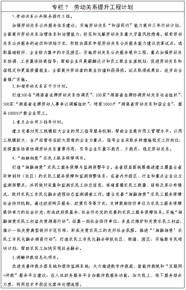 5.中國特色符合省情的和諧勞動關系體制機制基本健全。勞動關系治理能力明顯提高,勞動關系協(xié)調機制進一步完善,勞動關系總體和諧穩(wěn)定。鞏固完善“湘融湘愛”農民工服務保障體系。勞動保障監(jiān)察執(zhí)法體系進一步完善,勞動保障監(jiān)察基層隊伍力量明顯增強,根治欠薪成果更加鞏固?!半p隨機、一公開”執(zhí)法監(jiān)察體系基本構建,聯(lián)合懲戒機制作用有效發(fā)揮。