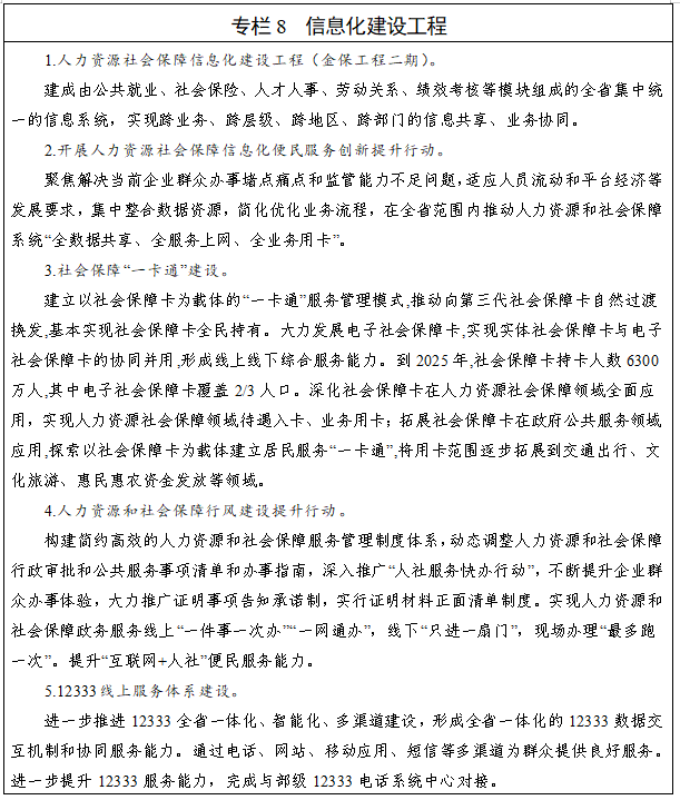 7.人力資源和社會保障公共服務體系更加完善。人力資源和社會保障公共服務制度和標準體系全面建立,智慧服務能力顯著提高,社會保障卡發(fā)行應用全覆蓋,基層公共服務條件進一步完善,基本公共服務可及性、均等化顯著增強,實現(xiàn)公共服務一體化,服務渠道多元化,信息服務智能化。