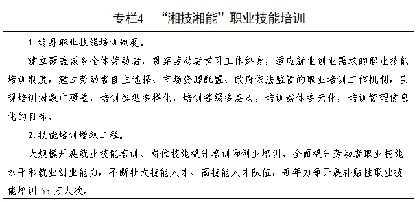 7.大規(guī)模開展職業(yè)技能培訓。建立并推行覆蓋城鄉(xiāng)全體勞動者、貫穿勞動者生涯全過程、適應就業(yè)創(chuàng)業(yè)和人才成長需要以及經濟社會發(fā)展需求的終身職業(yè)技能培訓制度。加快推進公共實訓基地共建共享,強化職業(yè)技能培訓供需對接。實施技能培訓增效工程,著力打造“湘技湘能”職業(yè)技能培訓品牌。圍繞“現(xiàn)代農民培育計劃”,深入開展現(xiàn)代農民職業(yè)技能培訓;圍繞“農村實用人才帶頭人素質提升計劃”,加快高素質農村實用技能人才培養(yǎng);圍繞人才一體化培養(yǎng),推進農民培訓與職業(yè)教育銜接。大規(guī)模開展高質量職業(yè)技能培訓,不斷完善企業(yè)新型學徒制培訓制度,實現(xiàn)培訓對象廣覆蓋、培訓類型多樣化、培訓等級多層次、培訓載體多元化、培訓管理信息化,加大培訓資金投入,提高培訓質量,提升勞動者就業(yè)創(chuàng)業(yè)能力。