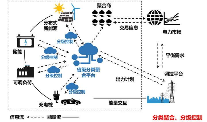 (十)推動(dòng)源網(wǎng)荷儲(chǔ)電力資源分類分級(jí)聚合。基于統(tǒng)一的數(shù)字底座、物聯(lián)采集與實(shí)時(shí)量測(cè)中心等技術(shù)架構(gòu),建立和完善省級(jí)源網(wǎng)荷儲(chǔ)分類聚合平臺(tái),通過(guò)統(tǒng)一平臺(tái)對(duì)源網(wǎng)荷儲(chǔ)四側(cè)資源分散聚合控制,實(shí)現(xiàn)電力系統(tǒng)分層分級(jí)的綜合動(dòng)態(tài)平衡。開展源網(wǎng)荷儲(chǔ)分類分級(jí)聚合頂層設(shè)計(jì),研究制定分類分級(jí)聚合的技術(shù)路徑和實(shí)施方案。推動(dòng)分布式光伏運(yùn)營(yíng)監(jiān)測(cè)平臺(tái)、配電監(jiān)控系統(tǒng)的升級(jí)改造和分級(jí)應(yīng)用,實(shí)現(xiàn)對(duì)分布式光伏的“剛性控”“柔性控”“群調(diào)群控”等多場(chǎng)景靈活控制。完善常規(guī)中小電源聚合平臺(tái),調(diào)動(dòng)中小電源深度聚合的積極性,提升中小電源統(tǒng)一調(diào)度能力,實(shí)現(xiàn)廣域協(xié)同、靈活互動(dòng)。深化建設(shè)新型負(fù)荷管理平臺(tái),提升新型負(fù)荷管理系統(tǒng)智能化、實(shí)用化水平,對(duì)負(fù)荷資源分層分類統(tǒng)一管理、統(tǒng)一調(diào)控、統(tǒng)一服務(wù)。建設(shè)用戶側(cè)儲(chǔ)能監(jiān)控平臺(tái),分級(jí)分類接入用戶側(cè)儲(chǔ)能電站數(shù)據(jù),實(shí)現(xiàn)海量用戶側(cè)儲(chǔ)能資源更大范圍的共享互濟(jì)和優(yōu)化配置。建立適應(yīng)源網(wǎng)荷儲(chǔ)分類分級(jí)聚合的調(diào)度模式和交易機(jī)制,貫穿省、市、縣三級(jí)調(diào)度系統(tǒng),制定并網(wǎng)管理、運(yùn)行控制相關(guān)標(biāo)準(zhǔn)規(guī)范,完善清潔能源、需求側(cè)資源和儲(chǔ)能參與電力市場(chǎng)的機(jī)制,依托統(tǒng)一的信息共享和技術(shù)支持平臺(tái),培育多類型聚合商參與分層分級(jí)聚合調(diào)度。構(gòu)建基于電網(wǎng)一張圖的新型電力系統(tǒng)全要素?cái)?shù)字底座,開展新型電力系統(tǒng)各要素承載力的可視化推演計(jì)算,實(shí)現(xiàn)配網(wǎng)各環(huán)節(jié)、各業(yè)務(wù)以及新要素的全面圖上管控,提升分布式資源消納能力。