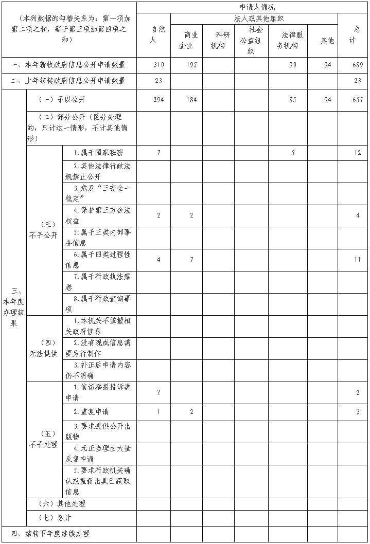 本年報(bào)根據(jù)《中華人民共和國(guó)政府信息公開(kāi)條例》(以下簡(jiǎn)稱(chēng)《條例》)編制。年報(bào)由總體情況、主動(dòng)公開(kāi)政府信息情況、依申請(qǐng)公開(kāi)政府信息情況、行政復(fù)議和行政訴訟情況、存在的主要問(wèn)題及改進(jìn)措施等部分組成。年報(bào)中所列數(shù)據(jù)的統(tǒng)計(jì)期限自2020年1月1日起至2020年12月31日止。本年報(bào)的電子版可在湖南省自然資源廳門(mén)戶(hù)網(wǎng)站(http://zrzyt.hunan.gov.cn)下載。如需咨詢(xún),請(qǐng)與湖南省自然資源廳駐湖南省政務(wù)服務(wù)大廳聯(lián)系(地址:長(zhǎng)沙市天心區(qū)銀杏路6號(hào),郵編:410029,電話:0731-82213813)。