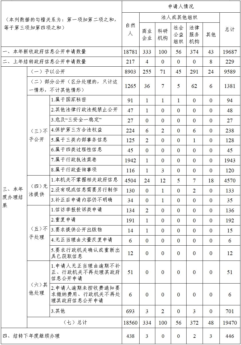 (二)依申請公開情況。全省各級各部門認真貫徹執(zhí)行政府信息公開條例有關依申請公開規(guī)定,依法依規(guī)辦理政府信息公開申請件,并堅持便民原則,滿足企業(yè)群眾個性化、合理化需求。2023年全省共收到依申請公開件19687件,上年度結轉辦理件229件,共辦理完成19470件,結轉到2024年辦理446件。其中,省政府辦公廳(省數據局)2023年收到政府信息公開申請375件,結轉上年度政府信息公開申請5件,共辦理完成379件,結轉下年度繼續(xù)辦理1件;發(fā)生行政復議7件,其中4件維持;發(fā)生行政訴訟5件,全部維持。