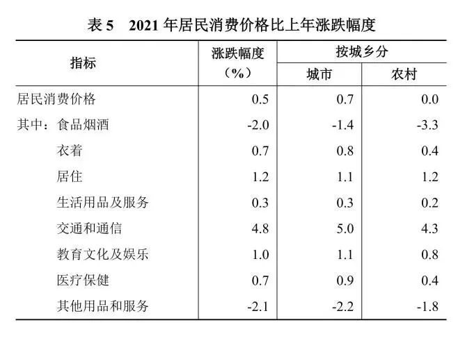 全年居民消費(fèi)價(jià)格比上年上漲0.5%。其中,城市上漲0.7%,農(nóng)村與上年持平。商品零售價(jià)格上漲1.6%。工業(yè)生產(chǎn)者出廠價(jià)格上漲5.9%,工業(yè)生產(chǎn)者購(gòu)進(jìn)價(jià)格上漲8.1%。農(nóng)產(chǎn)品生產(chǎn)者價(jià)格下跌9.9%。