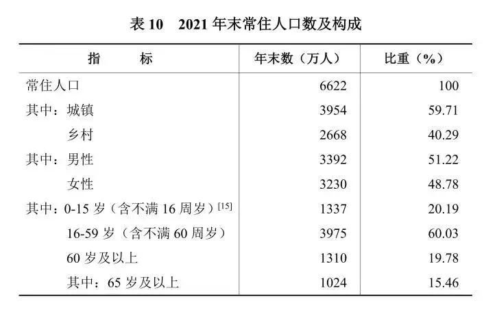 年末全省常住人口6622萬(wàn)人。其中,城鎮(zhèn)人口3954萬(wàn)人,城鎮(zhèn)化率59.71%,比上年末提高0.95個(gè)百分點(diǎn)。全年出生人口47.3萬(wàn)人,出生率7.13‰;死亡人口54.93萬(wàn)人,死亡率8.28‰;人口自然增長(zhǎng)率-1.15‰。0—15歲(含不滿16周歲)人口占常住人口的比重為20.19%,下降0.56個(gè)百分點(diǎn);16—59歲(含不滿60周歲)人口比重為60.03%,提高0.65個(gè)百分點(diǎn);60歲及以上人口比重為19.78%,下降0.10個(gè)百分點(diǎn)。