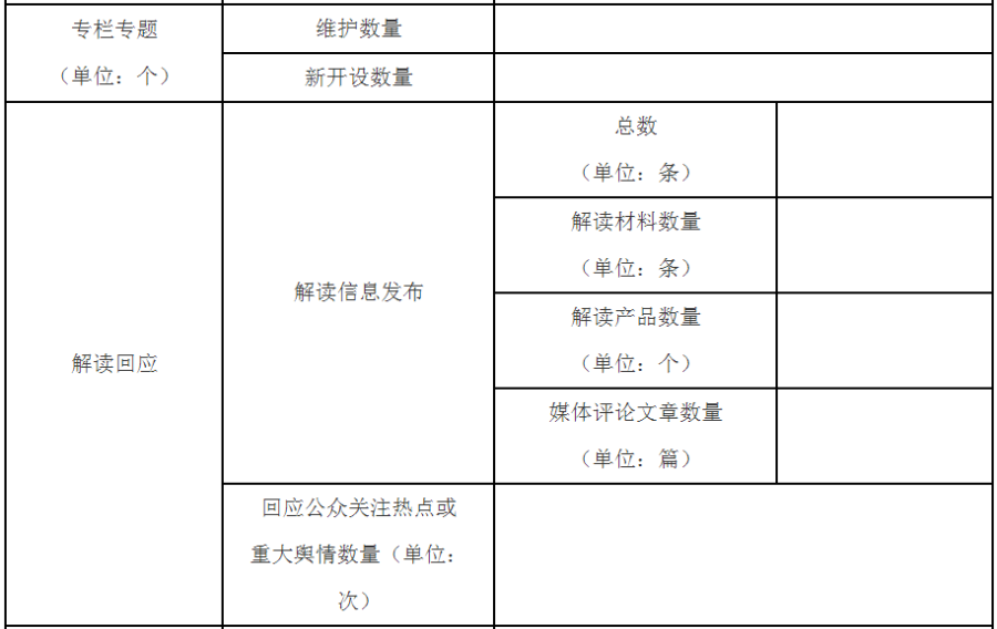 (2)解讀材料數(shù)量:請(qǐng)?zhí)顚懕灸甓染W(wǎng)站發(fā)布或轉(zhuǎn)載的對(duì)政策文件的解讀材料(以文字解讀為主)的總條數(shù),不包括外鏈信息。