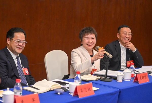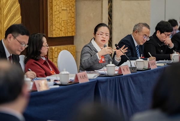1月14日下午,張家界市代表團(tuán)吳俞萍代表(中)就加快推進(jìn)溹水生態(tài)補(bǔ)水建設(shè),滿足游客、群眾用水需求建言。湖南日報全媒體記者 李健 鄒尚奇 攝影報道