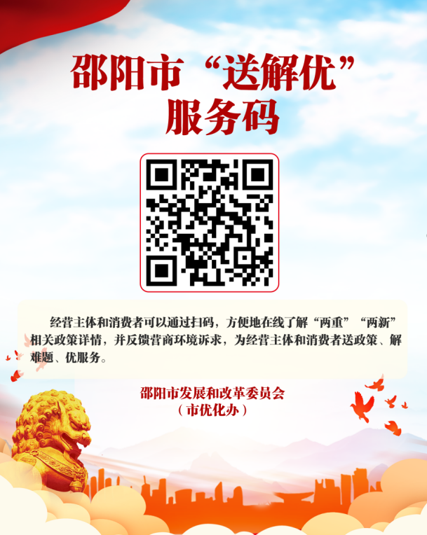 近段時(shí)間以來,邵陽市落實(shí)湖南省“兩重”“兩新”送解優(yōu)專項(xiàng)行動決策部署,積極走基層、入園區(qū)、進(jìn)企業(yè),創(chuàng)新推出“兩重”“兩新”送解優(yōu)服務(wù)碼,歸集融合營商環(huán)境110平臺,通過手機(jī)掃碼即可了解政策詳情和反映營商訴求,搭建政企溝通“連心橋”,推動“送政策、解難題、優(yōu)服務(wù)”常態(tài)長效、走深走實(shí)。