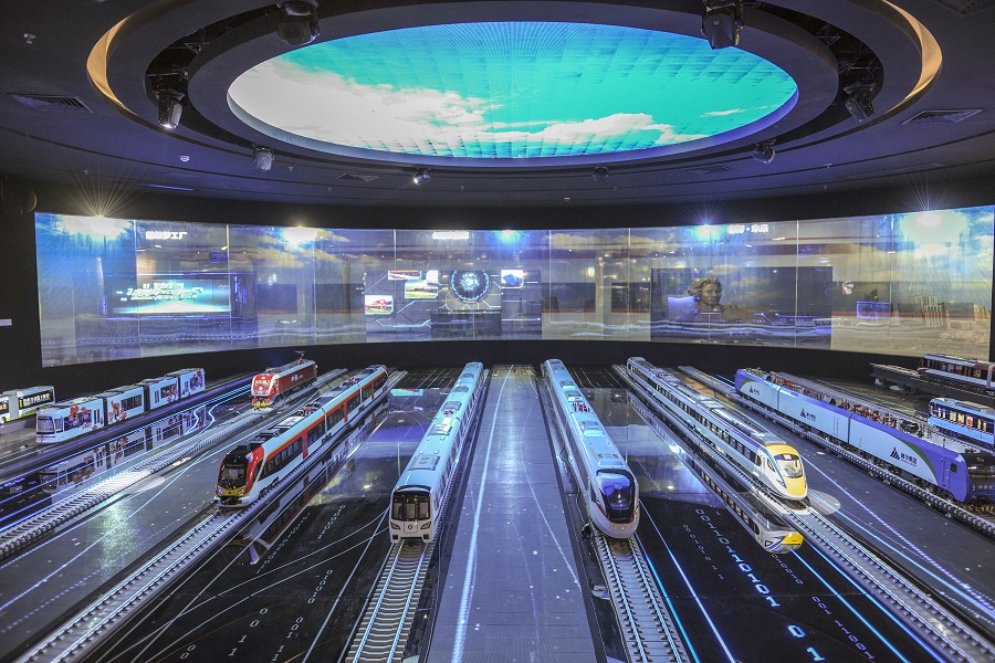 2019年6月26日,中車株機(jī)公司科技文化展示中心通過天屏、地屏、中屏以及車模的聲光電結(jié)合,呈現(xiàn)中車株機(jī)為客戶提供的軌道交通系統(tǒng)解決方案。