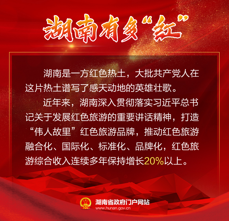 湖南是一方紅色熱土,大批共產(chǎn)黨人在這片熱土譜寫(xiě)了感天動(dòng)地的英雄壯歌。近年來(lái),湖南深入貫徹落實(shí)習(xí)近平總書(shū)記關(guān)于發(fā)展紅色旅游的重要講話精神,立足紅色資源的比較優(yōu)勢(shì),在保護(hù)好紅色文化和旅游資源的前提下,突出創(chuàng)新升級(jí),打造“偉人故里”紅色旅游品牌。