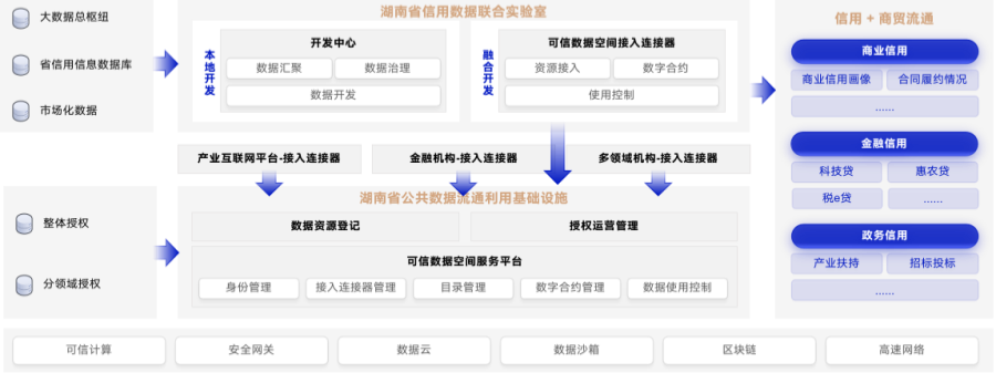 聯(lián)合實(shí)驗(yàn)室將開發(fā)形成的數(shù)據(jù)產(chǎn)品和服務(wù)上架至湖南省公共數(shù)據(jù)流通利用基礎(chǔ)設(shè)施,供各數(shù)據(jù)需求方靈活調(diào)用,如“湘信貸”平臺(tái)、商貿(mào)流通平臺(tái)及其他各類產(chǎn)業(yè)互聯(lián)網(wǎng)平臺(tái),充分釋放信用數(shù)據(jù)價(jià)值。