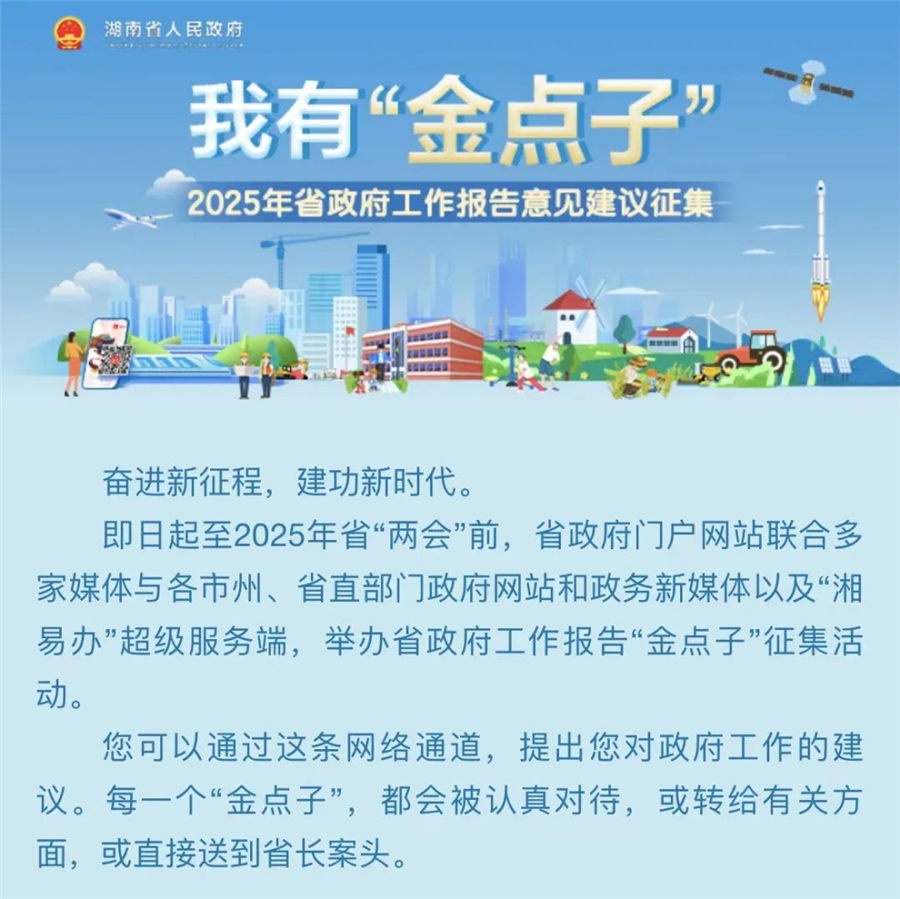 自11月29日起,湖南啟動(dòng)“我有‘金點(diǎn)子’——2025年湖南省政府工作報(bào)告意見(jiàn)建議征集”活動(dòng),這是湖南省政府連續(xù)第七年圍繞省政府工作報(bào)告開(kāi)門(mén)問(wèn)策、集思廣益?!坝^于明鏡,則疵瑕不滯于軀;聽(tīng)于直言,則過(guò)行不累乎身?!逼鸩菔≌ぷ鲌?bào)告是一個(gè)聽(tīng)民聲、察民情、匯民智、聚民力的過(guò)程,報(bào)告的每一項(xiàng)決策都與人民息息相關(guān)。細(xì)細(xì)梳理今年的19項(xiàng)議題,既有“三個(gè)高地”建設(shè)、鄉(xiāng)村振興、生態(tài)保護(hù)、民生改善、社會(huì)治理等常態(tài)化內(nèi)容,也有政策承接落地、數(shù)據(jù)等要素市場(chǎng)化配置、文化與科技融合發(fā)展等全新內(nèi)容。在不變與變化之間,折射出什么?