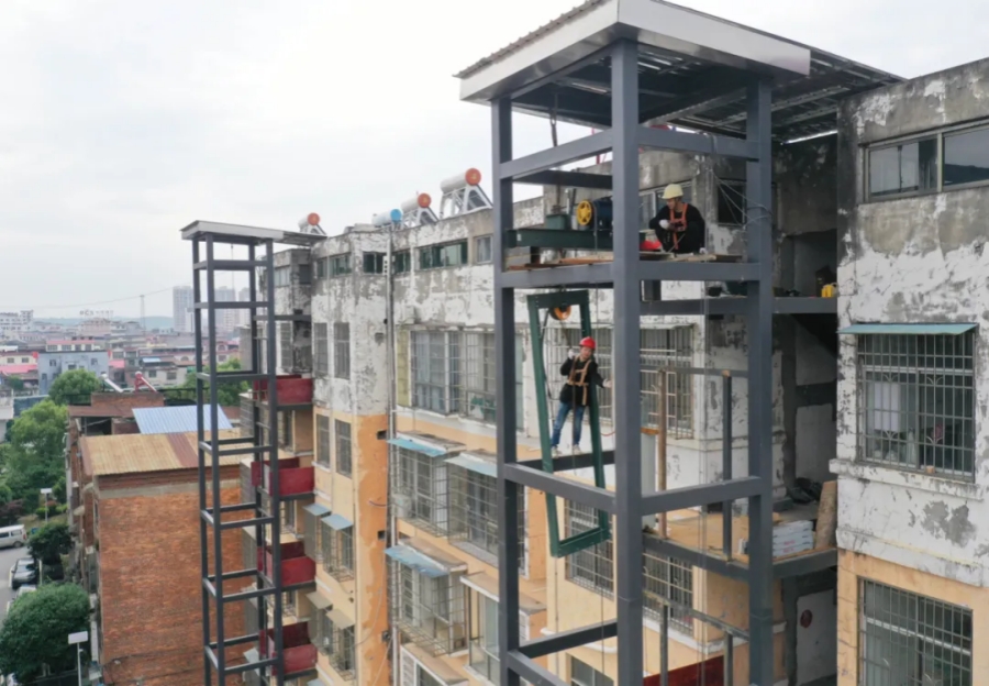 湖南道縣人民醫(yī)院家屬房老舊小區(qū),工人安裝電梯。何紅福 攝