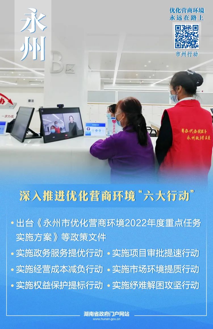 永州市把優(yōu)化營(yíng)商環(huán)境作為全市“一號(hào)工程”來(lái)抓,作為核心競(jìng)爭(zhēng)力來(lái)打造,出臺(tái)《永州市優(yōu)化營(yíng)商環(huán)境2022年度重點(diǎn)任務(wù)實(shí)施方案》《持續(xù)深化“放管服”改革全力促進(jìn)“五好”園區(qū)建設(shè)工作方案》《2022年度全市優(yōu)化營(yíng)商環(huán)境績(jī)效考核辦法》等文件,及時(shí)下發(fā)《營(yíng)商環(huán)境評(píng)價(jià)結(jié)果通報(bào)》《履約踐諾攻堅(jiān)行動(dòng)通報(bào)》,將相關(guān)工作要求層層傳遞到位。同時(shí),深入推進(jìn)優(yōu)化營(yíng)商環(huán)境“六大行動(dòng)”。