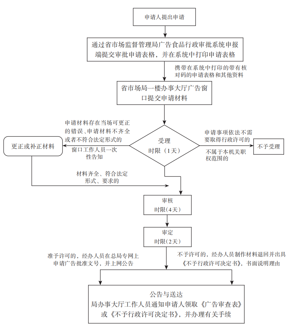 申請(qǐng)人通過(guò)省市場(chǎng)監(jiān)督管理局廣告食品行政審批系統(tǒng)申報(bào)端提交審批申請(qǐng)表格,并在系統(tǒng)中打印申請(qǐng)表格,攜帶在系統(tǒng)中打印的帶有核對(duì)碼的申請(qǐng)表格和其他資料,前往湖南省市場(chǎng)監(jiān)督管理局政務(wù)服務(wù)大廳現(xiàn)場(chǎng)辦理。