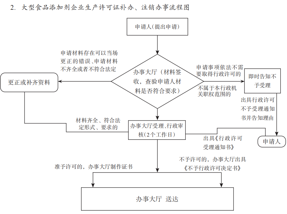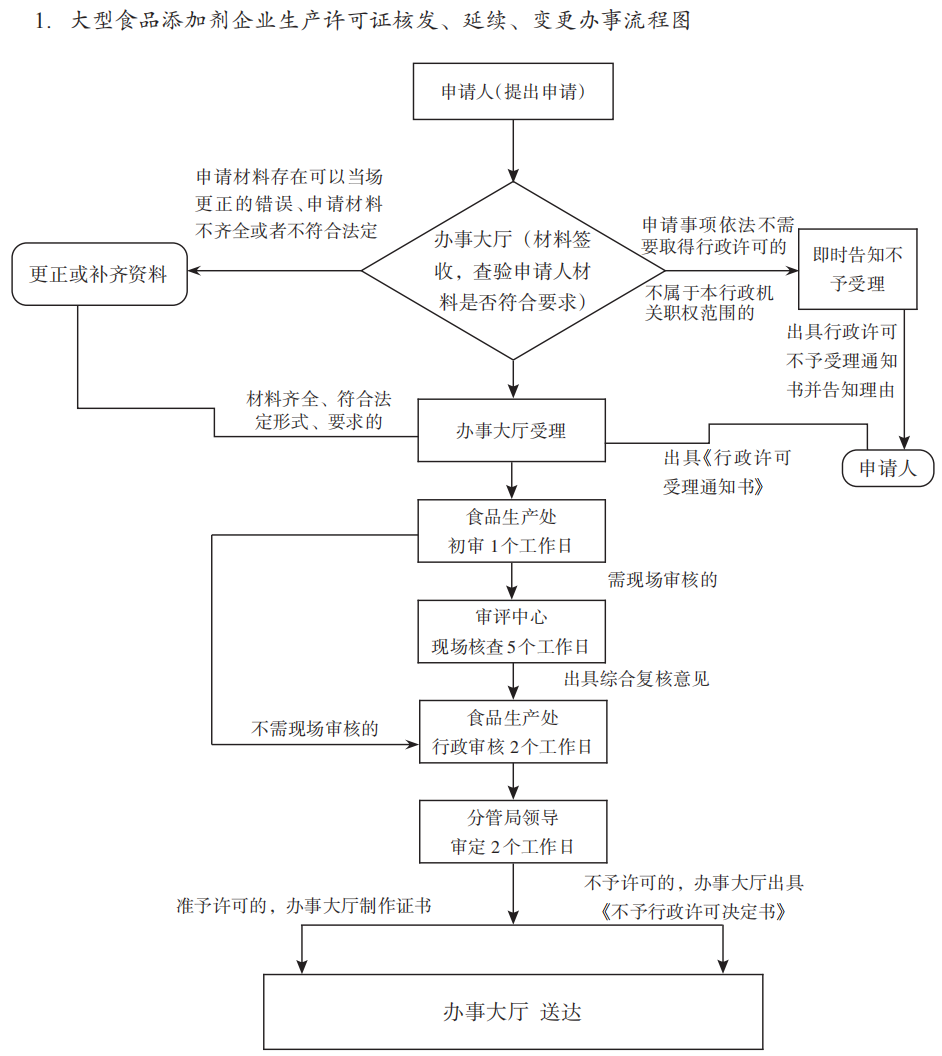 自受理之日起,辦理大型食品添加劑企業(yè)生產(chǎn)許可證核發(fā)、延續(xù)、變更事項 10 個工作日, 補辦、注銷事項2個工作日做出行政許可決定 (不包括材料補正、補充、許可中止、公告時間),因特殊情況需要延長期限的,經(jīng)本級行政機關(guān)負責(zé)人批準,可以延長5個工作日。