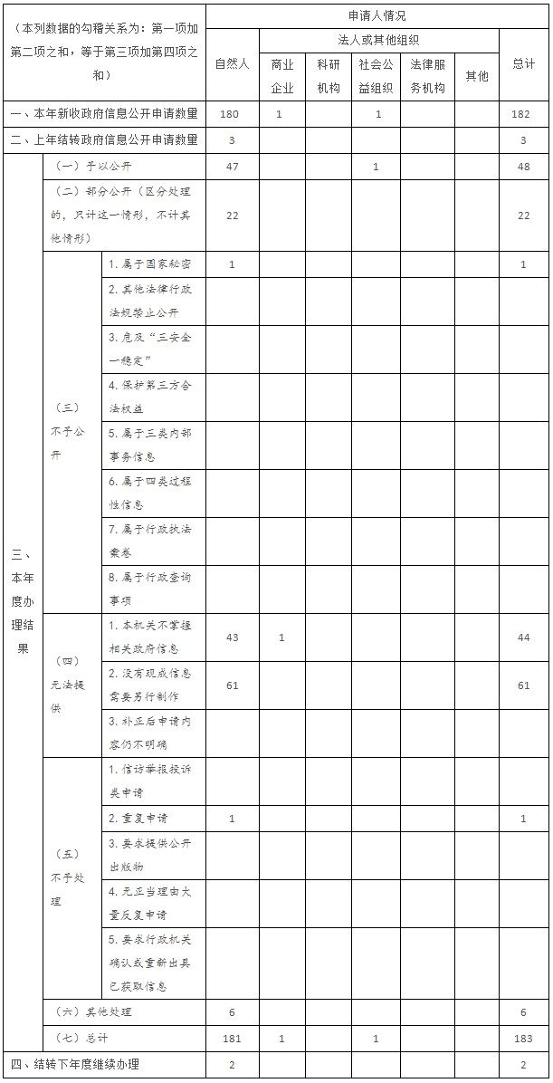 切實(shí)保障人民群眾依法獲取政府信息,按照“集中受理、分散辦理、全程跟蹤”的原則,對政府信息公開申請事項(xiàng)進(jìn)行審核、受理、登記、分發(fā)、追蹤、答復(fù)、歸檔等規(guī)范化流程處理。2019年共收到政府信息公開申請182件,除結(jié)轉(zhuǎn)到下一年辦理的2件外,均按期依規(guī)依程序答復(fù),全年未收取信息處理費(fèi)。發(fā)生行政復(fù)議8件、行政訴訟5件,已經(jīng)審結(jié)12件、尚未審結(jié)1件,沒有發(fā)生結(jié)果糾正或敗訴情形。