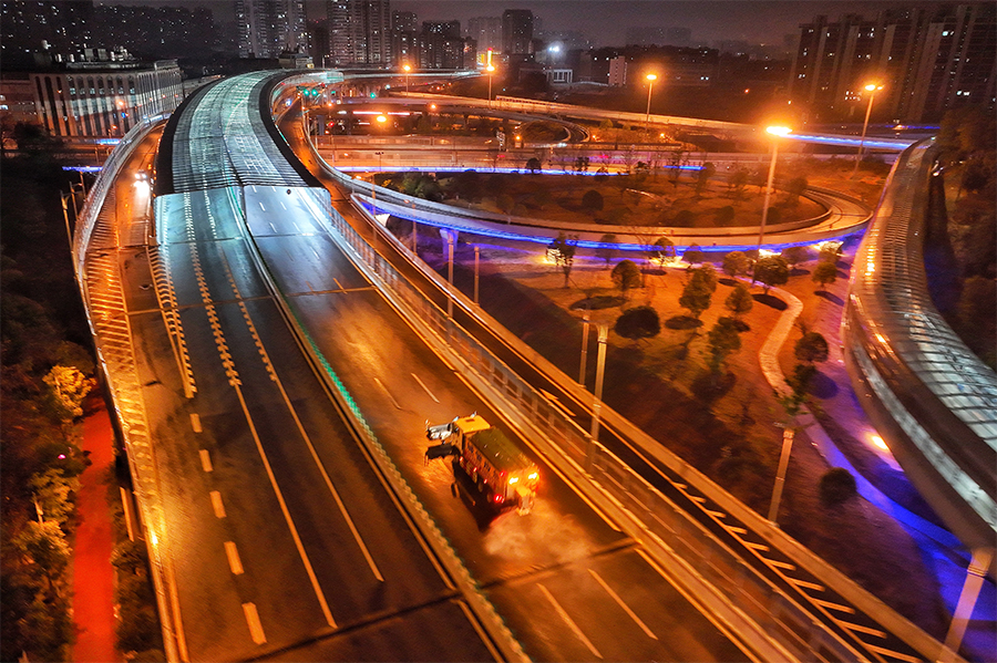 1月19日23時40分,萬家麗高架橋,長沙市城管局組織工程車為道路撒鹽。當天,長沙市進入低溫雨雪天氣,該局啟動防范寒潮低溫雨雪和掃雪除冰攻堅工作,保障城市道路安全暢通。 湖南日報全媒體記者 傅聰 攝