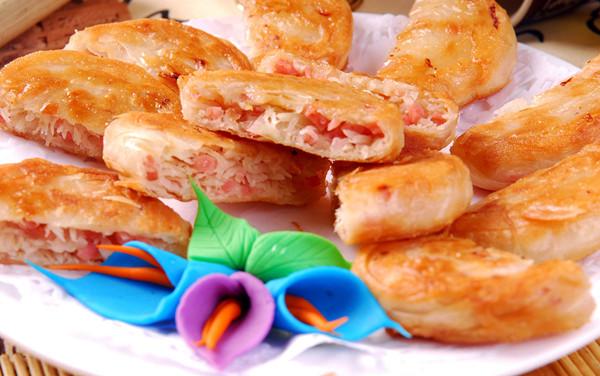 原料:每20個(gè)蘿卜絲餅需水調(diào)面300克、油酥面200克、白蘿卜750克、熟火腿100克、金鉤50克、鮮豬肉100克,味精、食鹽、蔥白、青蒜梗、醬油、麻油、胡椒粉各適量,植物油1000克(實(shí)耗100克)。制法:白蘿卜洗凈去皮,切成絲,用鹽腌一下,擠干水份;鮮豬肉洗凈剁成肉泥,金鉤浸發(fā)剁末,熟火腿切末,蔥白切花,青蒜梗切絲。以上各料與籮卜絲合在一起,再加入味精、醬油、麻油、胡椒粉等拌勻成餡,分成若干份;將水調(diào)面和油酥面各分成20個(gè)劑子,先將水調(diào)面劑子按扁,包入油酥面劑子,再按扁,用檊面棍檊成長(zhǎng)皮,由一頭卷成筒,再檊成長(zhǎng)皮,再由一頭卷成筒,然后豎著檊成園皮,放入一份蘿卜餡,先包成球形,再按成鼓形,入沸油鍋中炸成金黃色時(shí)出鍋即成。