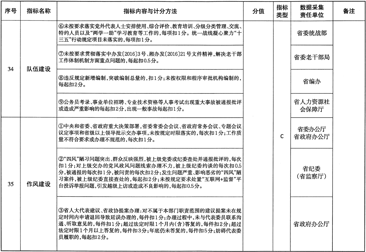 1.?dāng)?shù)據(jù)采集。2018年1月15日前,各地各部門將本地本部門指標(biāo)任務(wù)完成情況(含數(shù)據(jù)采集責(zé)任單位明確應(yīng)提供的佐證資料)上傳至湖南績效管理信息平臺(tái)。省直數(shù)據(jù)采集責(zé)任單位根據(jù)平時(shí)掌握的情況和各地各部門的自評結(jié)果及佐證材料,對指標(biāo)任務(wù)完成情況進(jìn)行考核驗(yàn)收與評分,并于2018年1月20日前,將評分?jǐn)?shù)據(jù)和扣分事項(xiàng)詳細(xì)說明通過湖南績效管理信息平臺(tái)報(bào)送至省績效辦。納入評估范圍的專項(xiàng)考核(如脫貧攻堅(jiān)等),必須體現(xiàn)省委、省人民政府對績效評估的原則要求,突出考核重點(diǎn),體現(xiàn)結(jié)果導(dǎo)向,考核內(nèi)容不重復(fù),不交叉,考核辦法和指標(biāo)須報(bào)省績效評估委員會(huì)統(tǒng)籌協(xié)調(diào)和審核把關(guān)后方能印發(fā)實(shí)施,年終考評時(shí)須按單位分類提供差異化考核結(jié)果。按照“誰采集、誰負(fù)責(zé)”的要求,各數(shù)據(jù)采集責(zé)任單位在數(shù)據(jù)采集過程中應(yīng)堅(jiān)持“以事實(shí)為依據(jù),以規(guī)則為準(zhǔn)繩”,做到公道正派、敢于擔(dān)當(dāng)。評分?jǐn)?shù)據(jù)和扣分事項(xiàng)報(bào)省績效辦前,應(yīng)聽取各有關(guān)單位意見,保證數(shù)據(jù)的準(zhǔn)確性和公正性。