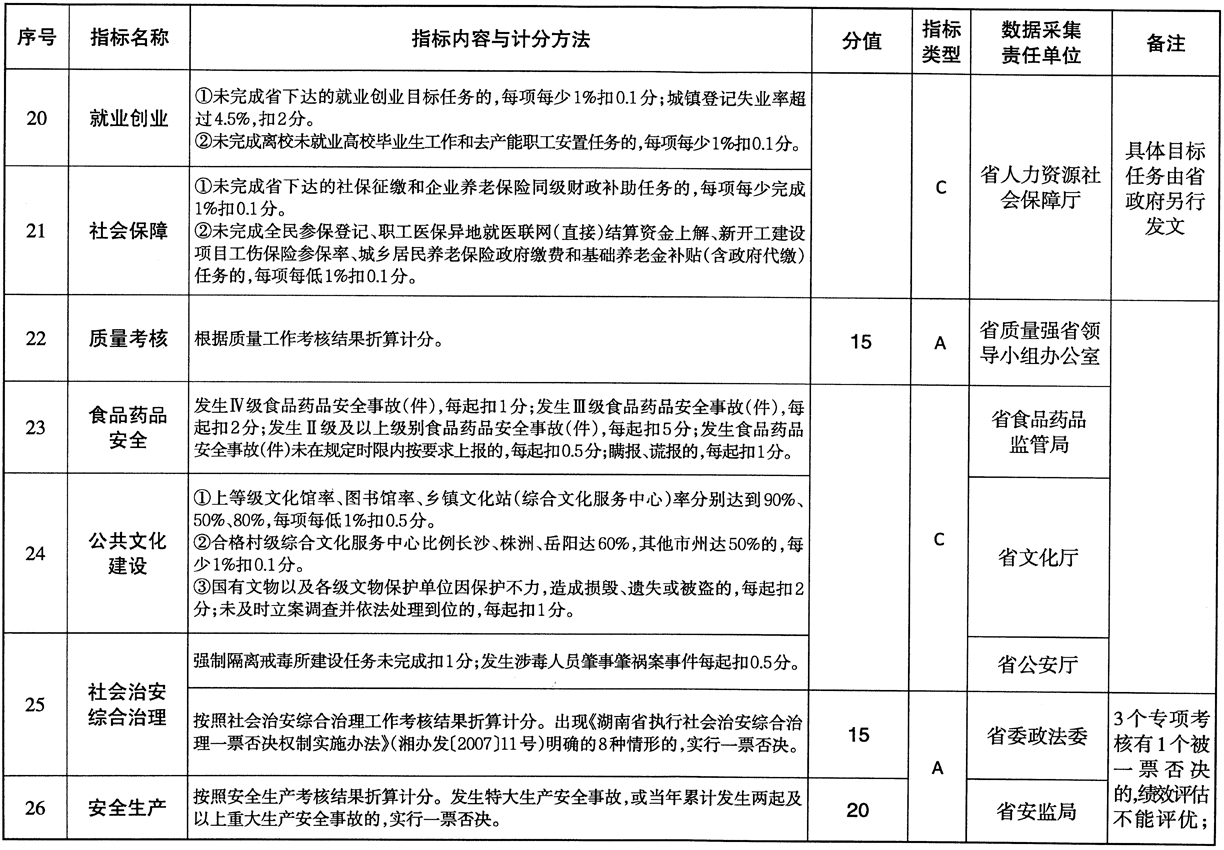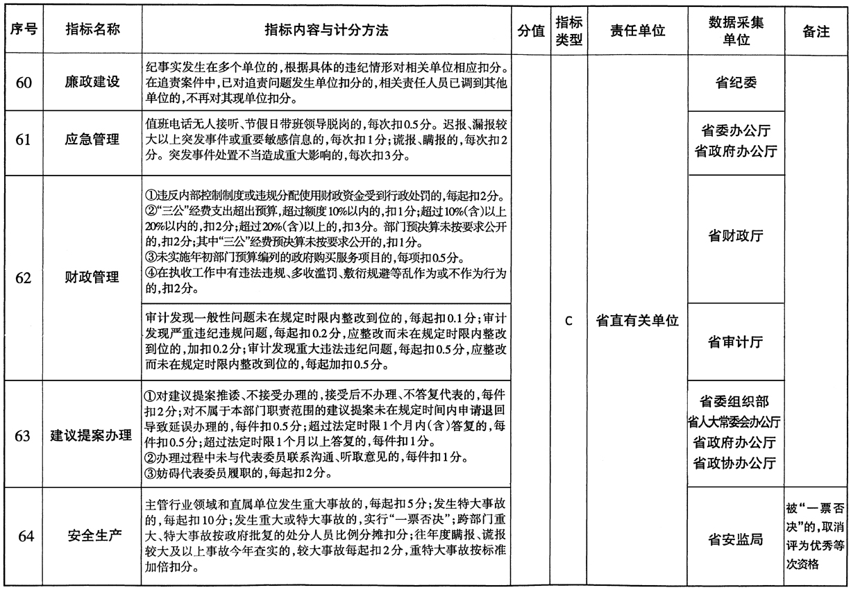 (四)不合格等次:有下列情形之一的單位,經(jīng)省績效評估委員會(huì)研究并報(bào)省委、省人民政府審定后,認(rèn)定為不合格等次:安全生產(chǎn)、社會(huì)治安綜合治理、計(jì)劃生育有兩項(xiàng)及以上被一票否決的;因工作失職瀆職造成重大損失或惡劣影響的。