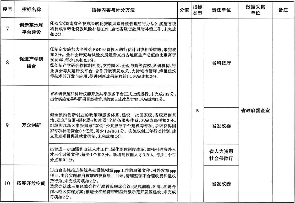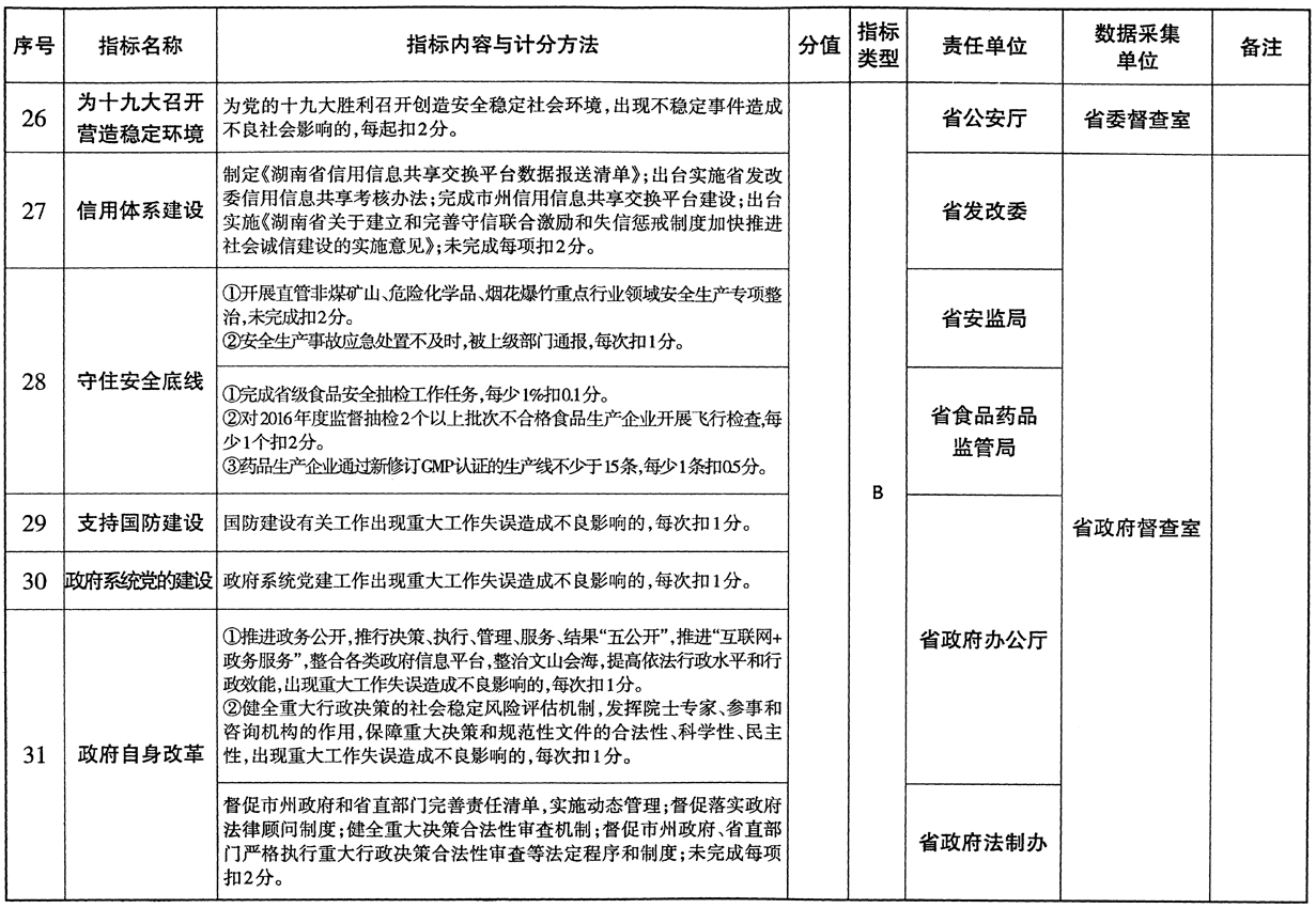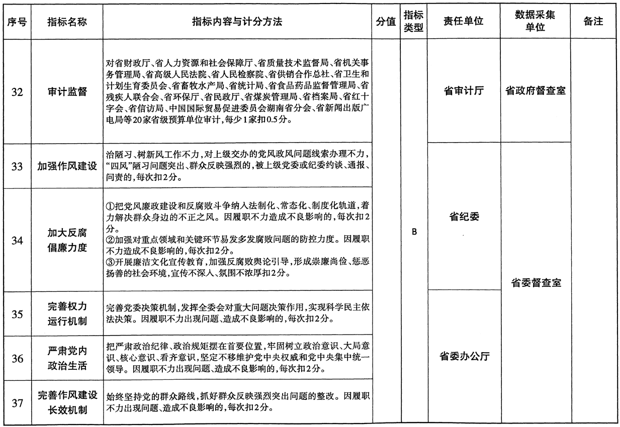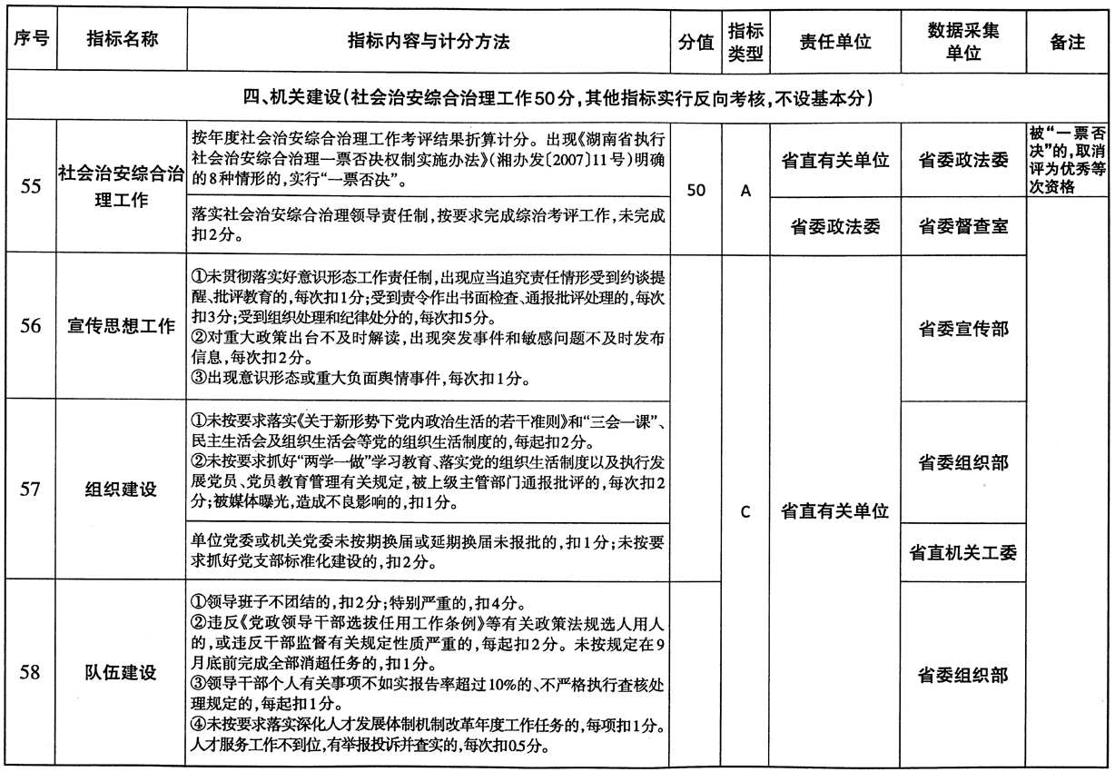 3.內(nèi)部評估。由省直單位評價(jià)市州黨委、政府和市州(縣市區(qū))黨委、政府評價(jià)省直單位組成(具體評估方式和評分細(xì)則另行制定)。