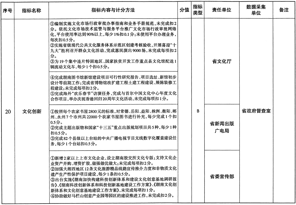 2.加分與扣分。加扣分的具體情形和標(biāo)準(zhǔn)(見《績效評估加扣分情況表》)(附表1—1)。市州和省直單位存在加分事項(xiàng)的,須在2018年1月10日前向省績效辦申報(bào),由省績效辦審核決定;1月10日以后申報(bào)的計(jì)入下年度績效評估。