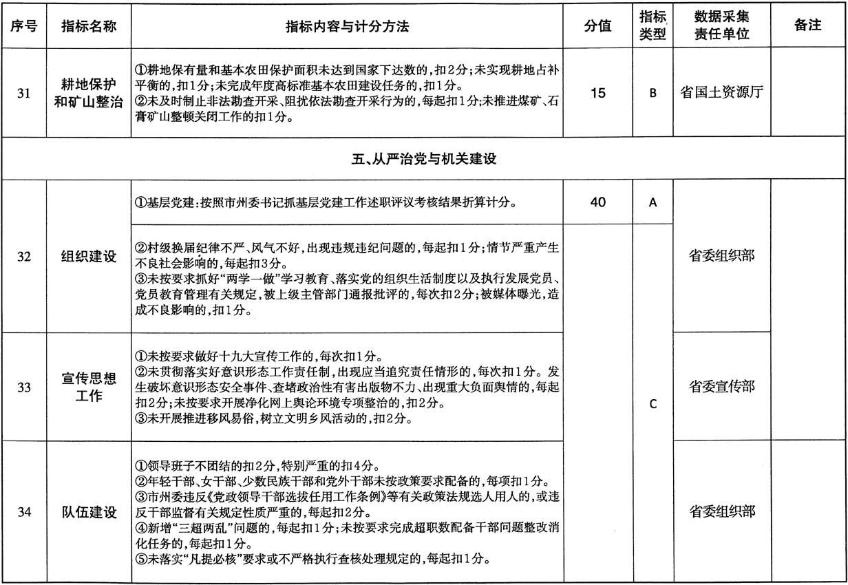 1.指標(biāo)評估。根據(jù)“五位一體”總體布局和“四個(gè)全面”戰(zhàn)略布局,市州分經(jīng)濟(jì)發(fā)展、改革創(chuàng)新、民生保障、生態(tài)保護(hù)、從嚴(yán)治黨與機(jī)關(guān)建設(shè)五大類指標(biāo)進(jìn)行評估。省直單位分脫貧攻堅(jiān)、重點(diǎn)工作、依法治省、機(jī)關(guān)管理四大類指標(biāo)進(jìn)行評估。